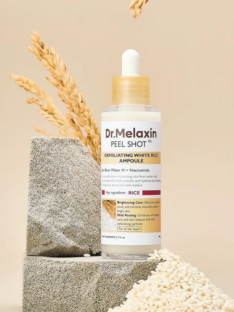Dr.Melaxin – Peel Shot Exfoliant White Rice Ampoule – 80 ml – μια αμπούλα απολέπισης που φωτίζει, λειαίνει το δέρμα, με εκχύλισμα λευκού ρυζιού και απαλούς απολεπιστικούς παράγοντες για να βελτιώσει την υφή, να εξομαλύνει τον τόνο και να αποκαταστήσει τη λάμψη. Η ελαφριά σύνθεσή του που απορροφάται γρήγορα προσφέρει ήπια καθημερινή απολέπιση ενώ θρέφει και ενυδατώνει το δέρμα για ένα απαλό, φωτεινό φινίρισμα.